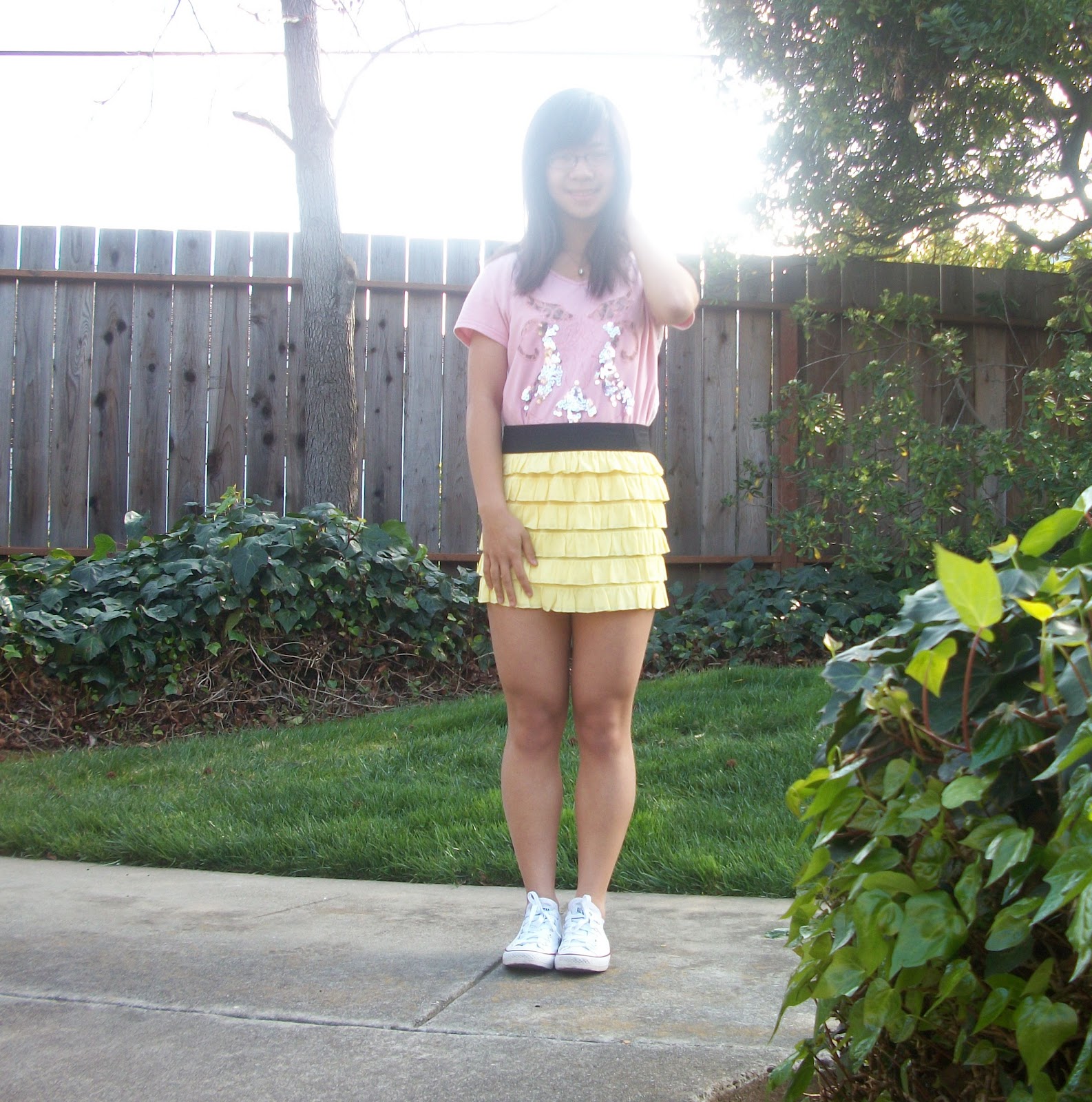 I am clearly in love with wearing a combination of pink and yellow (previous post also wearing pink and yellow here) and I guess wearing those colors just makes me super happy. Although, I've never really liked the color pink like most stereotyped girls. I've just never looked at the color and said "wow that's a pretty color". Now, mint green, on the other hand: who can resist and not admire such an appealing refreshing color? Outfit incorporating mint green coming soon in the near future, by the way. But back to the outfit: pink shimmering top with a delicate neckline and floral lace, paired with a fluttering yellow skirt and gold jewelry. Hopefully, you can also find some room in your daily outfits for a bit of pink and yellow, hehe.